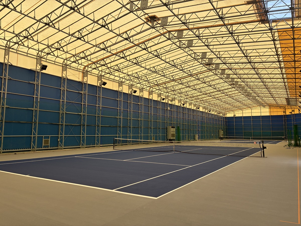 インドアテニススクールホリゾン岸和田校では下地修正を入念に行い、ブルー&グレーのコートにリニューアルしました。